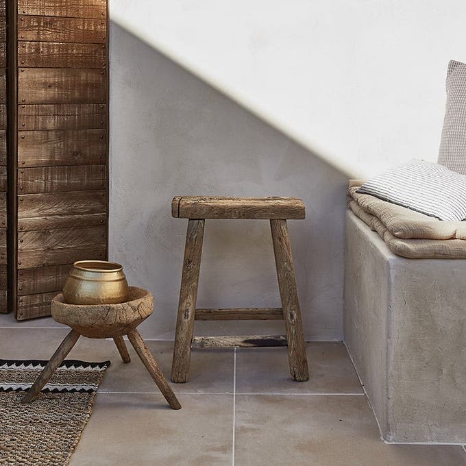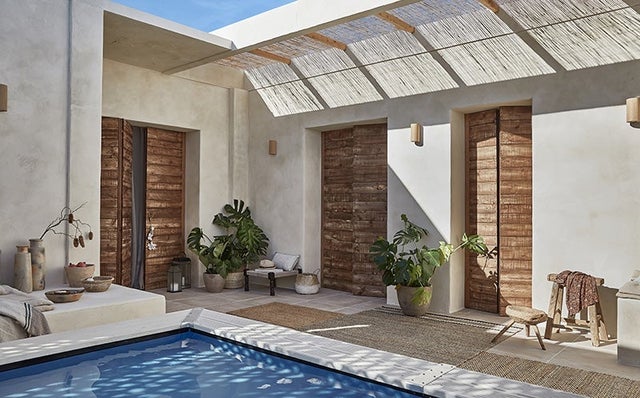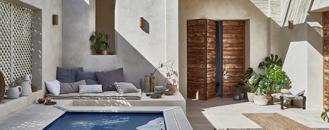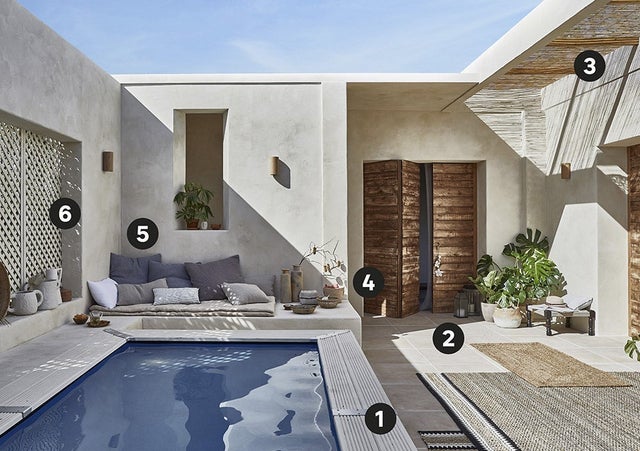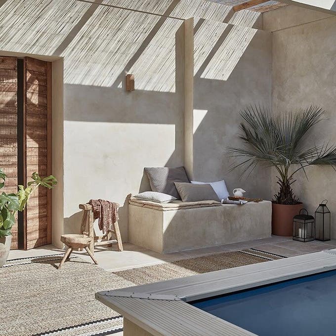 On s’inspire de la tendance desert soft pour la décoration du patio, avec des camaïeux de beiges et de gris, des matériaux bruts (terre cuite, bois, métal patiné) et des objets ethniques.
