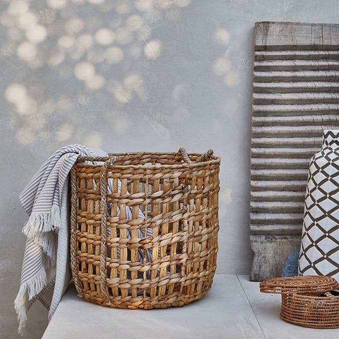 Côté accessoires, on reste dans la même palette de tons et de matières : paniers en fibres végétales, céramiques aux lignes épurées, colliers de coquillages…