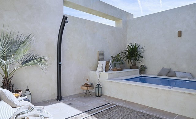 À proximité, on installe une douche d'extérieur solaire, idéale pour se rincer ou simplement se rafraîchir. On la choisit simple et graphique, pour rester dans l’esprit de l’ambiance épurée.