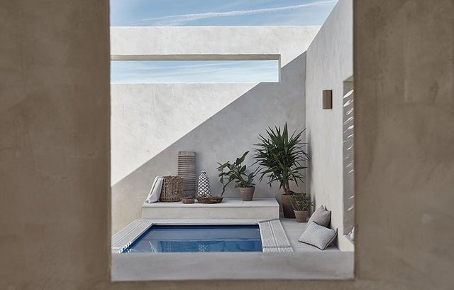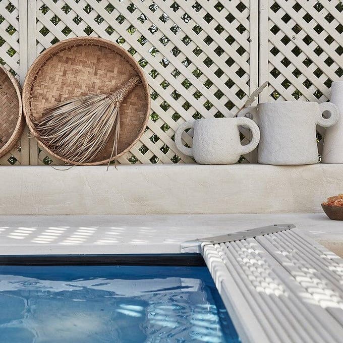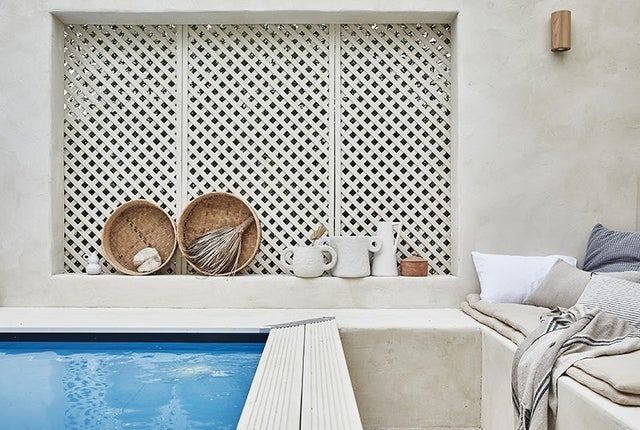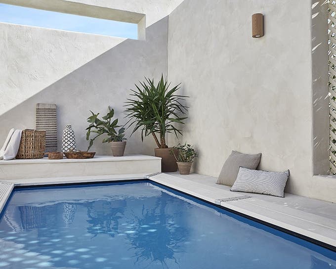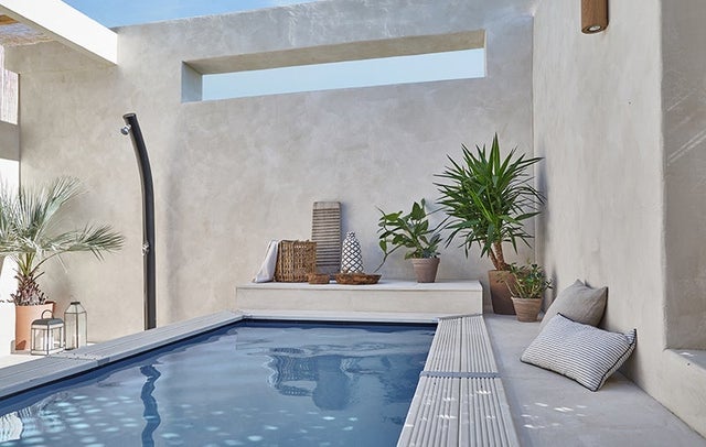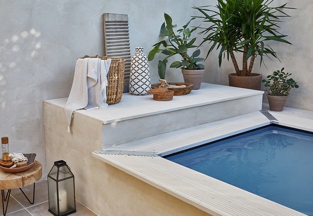Pouvoir profiter d’une piscine pour se rafraîchir alors que l’on ne disposeque d’une cour de 35m2, c’est possible ! En y installant une piscinede 2 x 3,5mètres et en réaménageant l’espace en patio inspiré des cours méditerranéennes, on se relaxe tout en voyageant ! Du sol aux murs, le décor monochrome crée une ambiance chic et authentique. Pour réchauffer, on joue l’accumulation de coussins moelleux, de tapis en fibres naturelles, de pots en terre cuite et de lanternes, dans un style désert soft très tendance. Touche finale, des plantes vertes aux feuillages graphiques ajoutent une pointe d’exotisme.