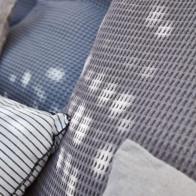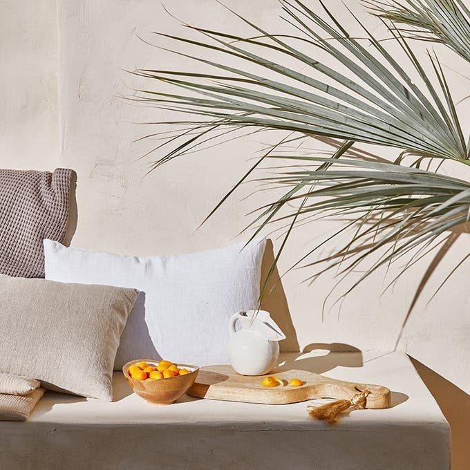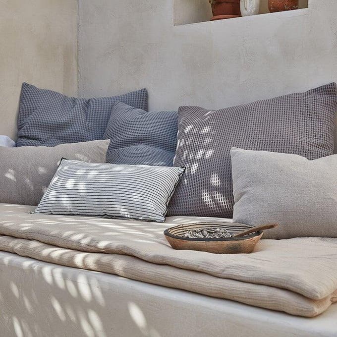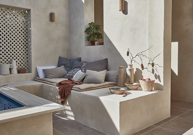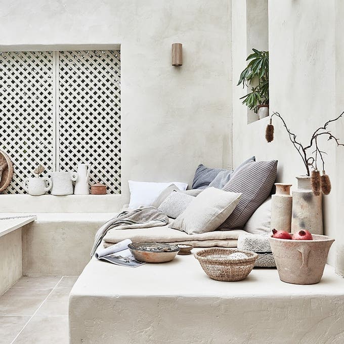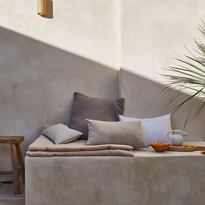 Indispensables pour habiller et rendre les banquettes maçonnées confortables : l’accumulation de coussins que l’on complète de matelas et de plaids.