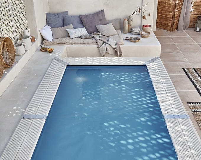 En installant une petite piscine rectangulaire de 2 sur 3,5 mètres dans la cour, on transforme radicalement l’espace, qui paraît aussitôt plus grand.