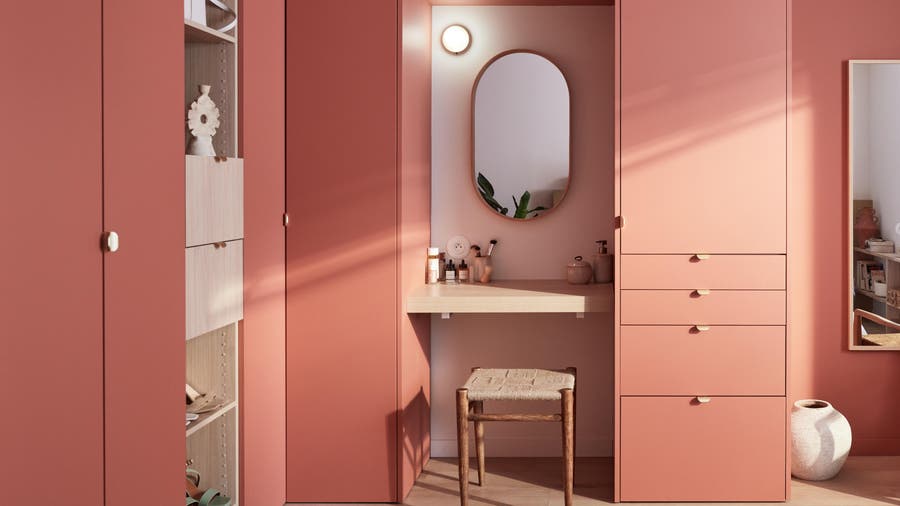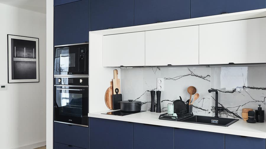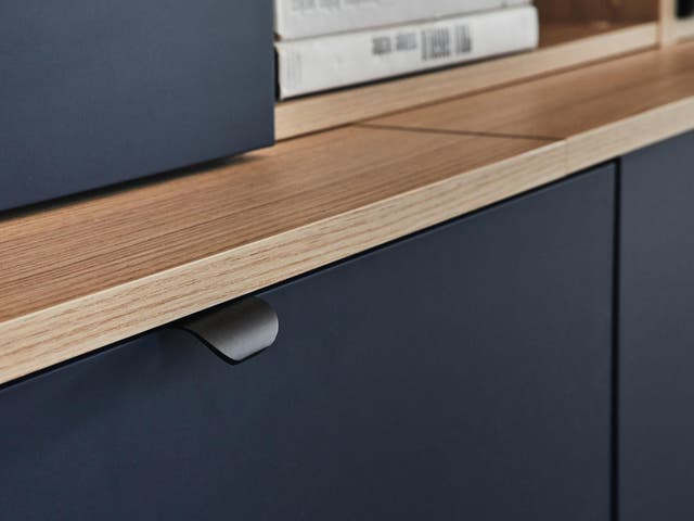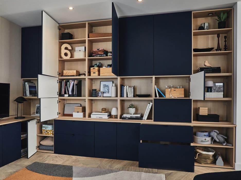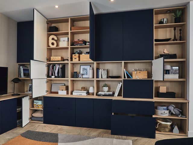 Comme il existe un large choix de couleurs, autant dans les caissons que dans les façades, on a décidé d’associer des caissons effet bois aux façades bleu profond avec des modules ouverts.