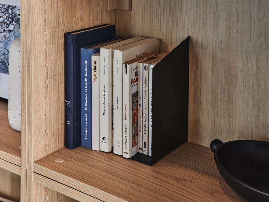 Dans les modules ouverts, on garde ce qui est agréable à regarder : ses livres préférés, quelques objets de déco. Dans les modules du bas, on range surtout ce qui doit rester accessible pour les enfants comme les jouets, les carnets de coloriage, les affaires de sport et les plaids.