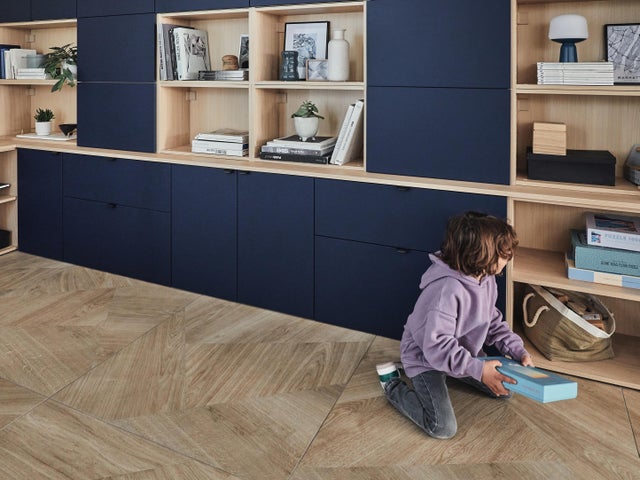 Le canapé assure le confort, il est assorti au bleu du mobilier. La table basse est blanche et simplissime. Mention spéciale au carrelage effet bois clair, cosy dans son matériau mais ultra-design dans sa découpe géométrique inédite.