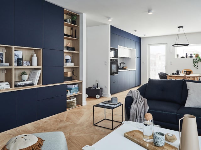 Le meuble côté salon fait écho au meuble de la cuisine avec ce même bleu marine. Dans le salon, il s’agit d’une composition de modules de la gamme Evo’M, faciles à monter, avec des façades bleu profond.