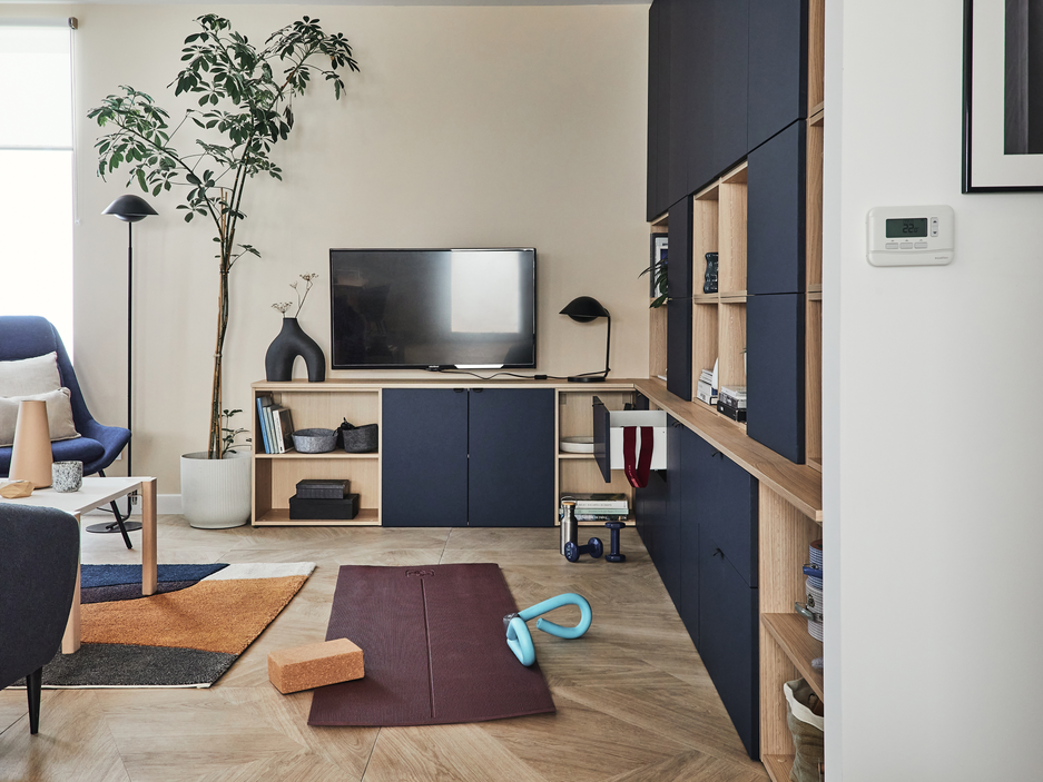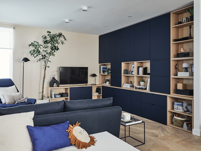 L’équation décorative à résoudre, c’est donc de choisir des meubles aux lignes simples tout en créant une déco chaleureuse pour un salon convivial. On relève le défi avec un meuble qui mixe bleu profond et bois clair pour la chaleur.