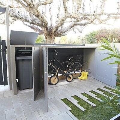 Côté jardin, un double abri permet de ranger la poubelle et les vélos. Ainsi, plus rien ne traîne !