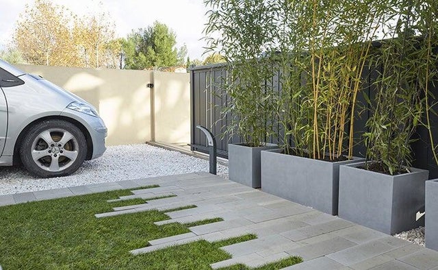 L’intégration du portail a elle aussi fait l’objet d’une attention toute particulière, puisque ce dernier disparaît derrière une haie de bambous en pots. Ceux-ci ont été choisis en harmonie, rectangulaires, carrés et gris.