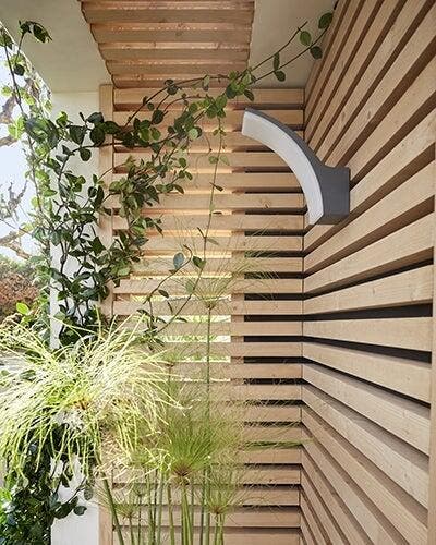 L’angle gauche est habillé d’un bardage bois à claire-voie qui donne une belle touche contemporaine et un charme très « nature » à l’entrée. Ce lattis habille également un discret puits de lumière, filtrant ainsi les rayons du soleil. Le soir venu, c’est une applique design qui prend le relais et éclaire le porche.