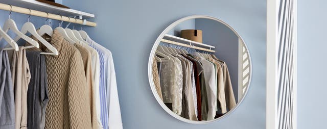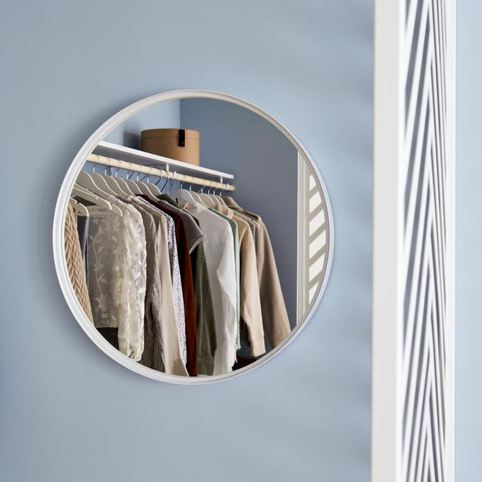 Et pour faciliter les essayages, on n’oublie pas le miroir : avec un modèle blanc de forme ronde, on ajoute de la douceur.