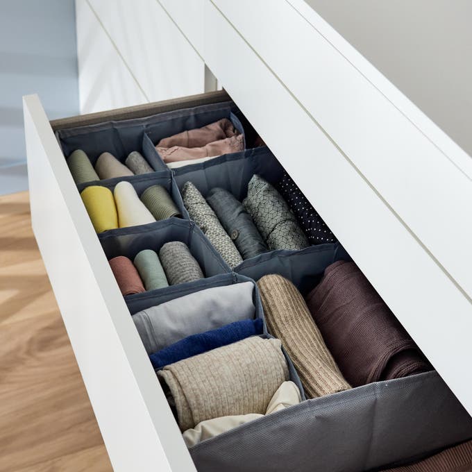 Pour composer les meubles bas, on associe différentes hauteurs de tiroirs adaptées au type de vêtements ou d’accessoires à ranger. Mieux, on les équipe d’organiseurs pour ranger efficacement bijoux, sous-vêtements, chaussettes, t-shirts, etc.