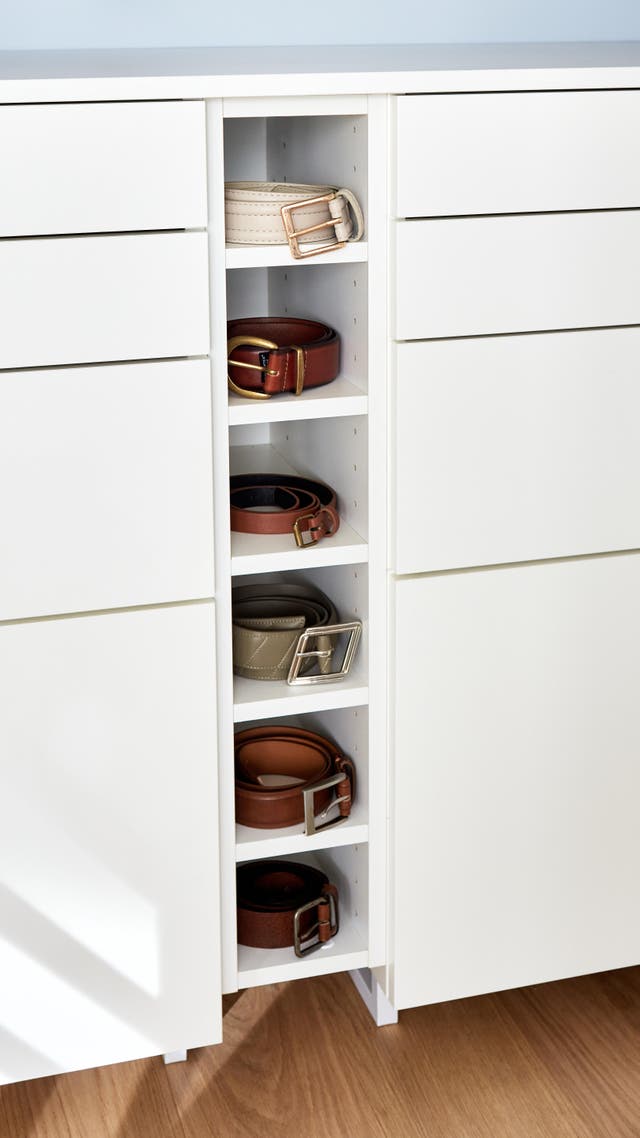 La bonne idée ? On détourne un caisson de cuisine de faible largeur et on le glisse entre deux séries de tiroirs : sa présence crée une animation visuelle, donne du rythme à la composition et ses petits compartiments seront parfaits pour accueillir les ceintures !