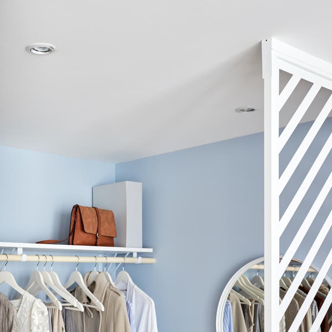 La touche finale pour faire du dressing un espace fonctionnel de jour comme de nuit : un éclairage efficace grâce à des spots encastrés au plafond, à la fois discrets et puissants.