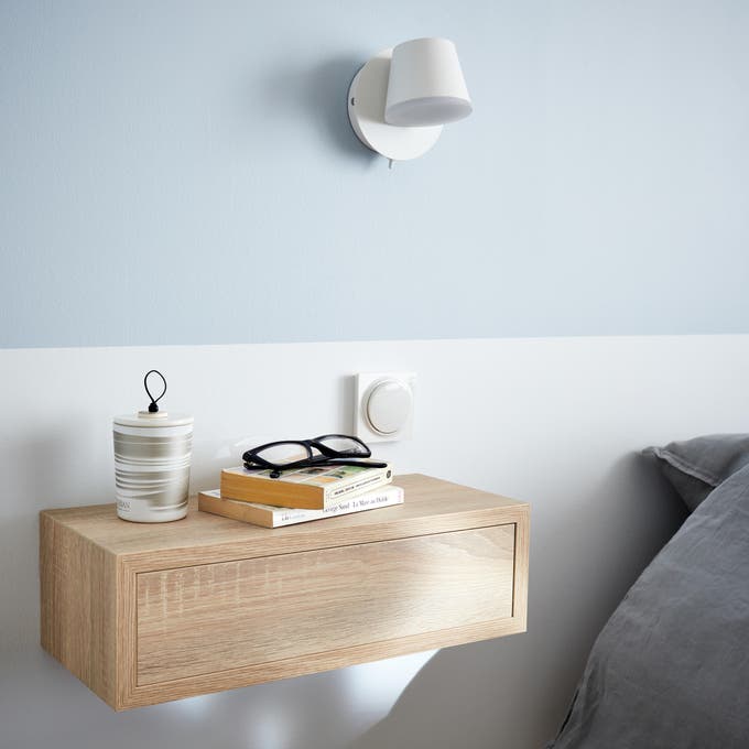 Côté chambre, on reste dans l’esprit léger du dressing, avec une table de chevet déco et astucieuse : une étagère tiroir en bois blond, mise en valeur par le soubassement blanc.