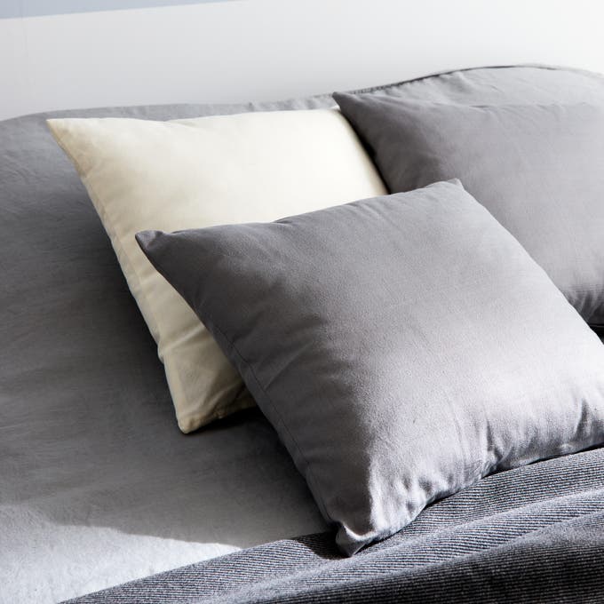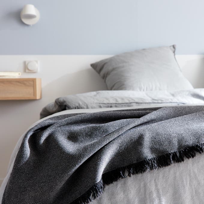 Côté textiles, les matières sont naturelles et douces. Coussins et linge de lit déclinent les tons gris et les blancs, l’assurance d’une ambiance apaisante et élégante !