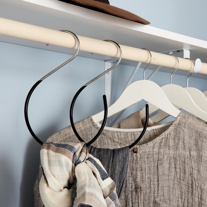 Les cintres étant apparents, on les préfère blancs ou en bois brut, assortis à l’étagère et à la barre de penderie et on complète avec des cintres spécifiques pour foulards et écharpes