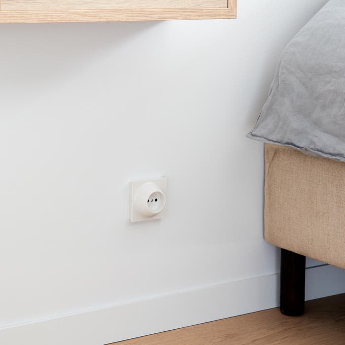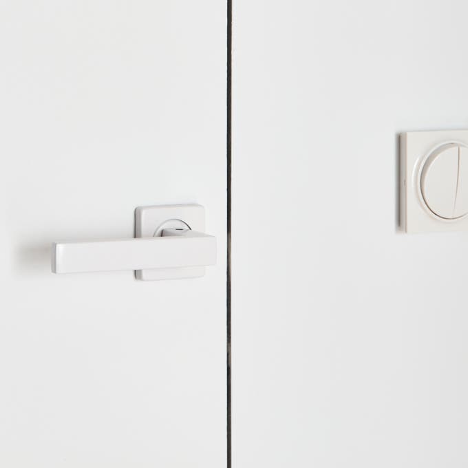 Pour les appliques, les interrupteurs, les prises ou la poignée de porte, on choisit des formes épurées et des modèles blancs pour une belle unité d’ensemble.