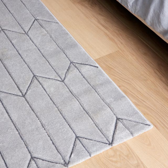 Au programme, un design sobre mais aussi de la douceur avec au sol un parquet en bois blond qui réchauffe. Et pour accroître la sensation de confort, on ajoute un tapis dont le motif fait écho aux chevrons des cloisons.