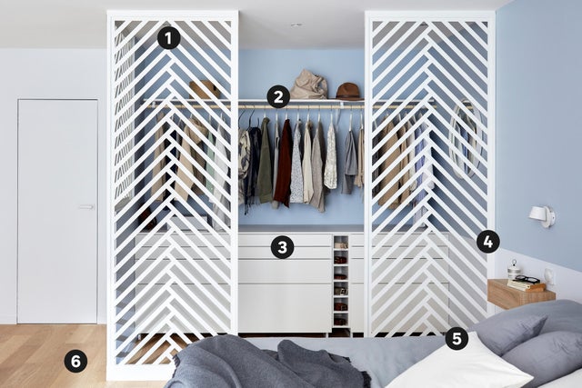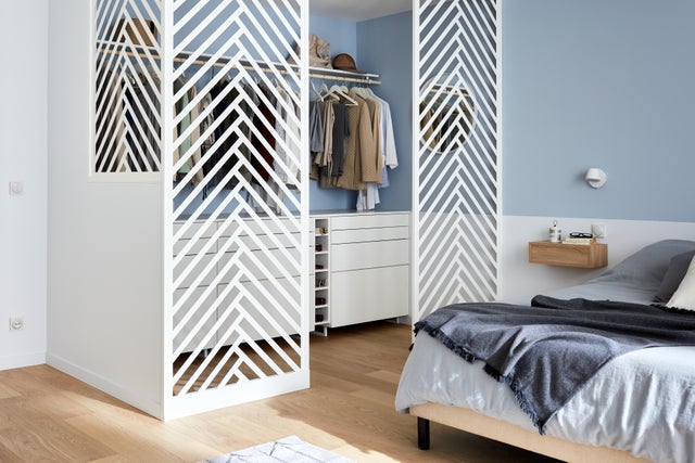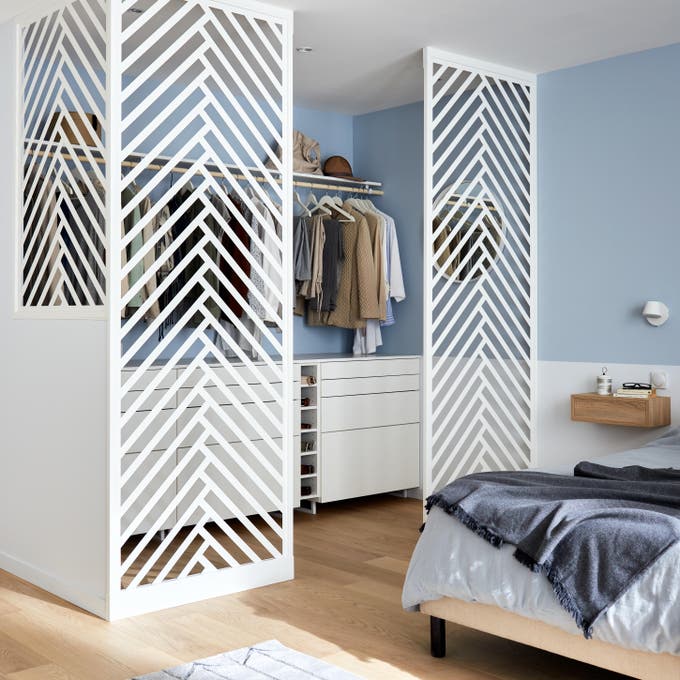Trouver de la place pour ranger ses affaires est toujours un casse-tête. Alors, pourquoi ne pas dédier une partie de la chambre à l’aménagement d’un dressing ? Si vous avez envie d’un espace pratique et baigné de lumière naturelle pour votre garde-robe, oubliez les traditionnels placards fermés et optez pour des cloisons ajourées : faciles à poser, elles permettent de délimiter sans enfermer, tout en étant particulièrement décoratives. Pour renforcer la légèreté de l’installation, on crée un linéaire de rangement façon boutique, fonctionnel et stylé, dans une harmonie de blanc et de bleu gris moderne et élégante. Découvrez comment vous en inspirer.