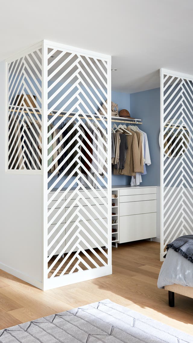 Pour créer un mur retour mixant partie pleine et ajourée, on utilise la même cloison dans sa version demi-format, idéale pour augmenter l’apport de lumière naturelle au cœur du dressing.