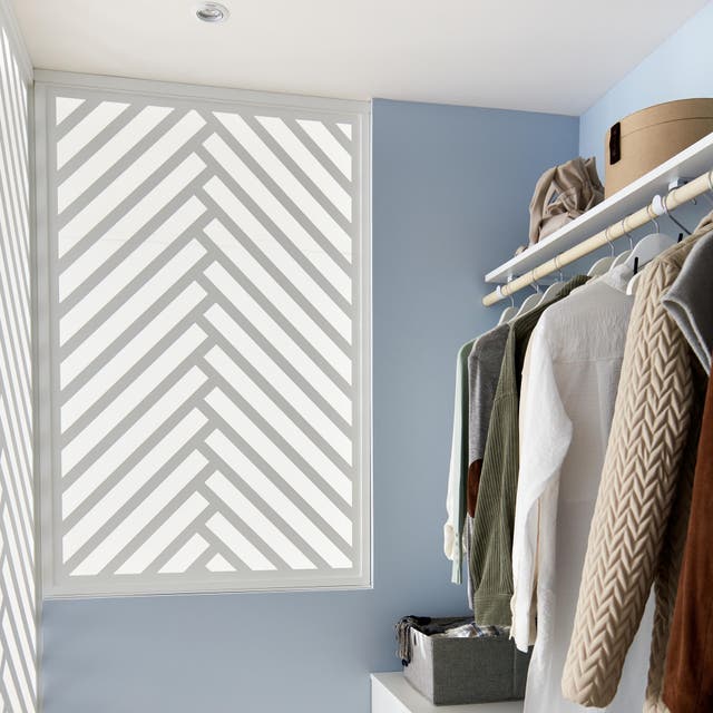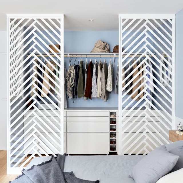 De dimensions standards, ces cloisons de séparation de 250 cm de haut et 88 cm de large sont ajustables en hauteur et faciles à installer. En acier blanc, leurs chevrons design « brouillent » la vue sur l’intérieur du dressing tout en donnant du cachet à la chambre.