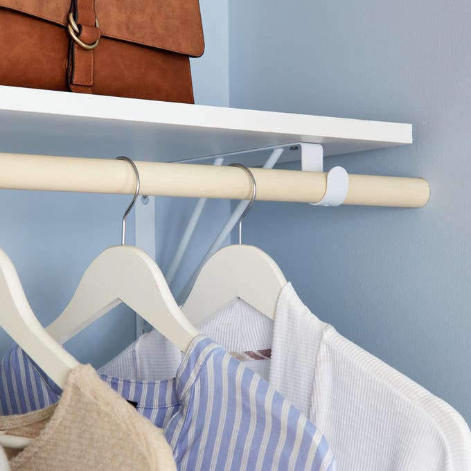 Pour la penderie, on détourne une tringle à rideaux que l’on fixe sous l’étagère à l’aide de supports adaptés.