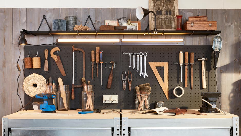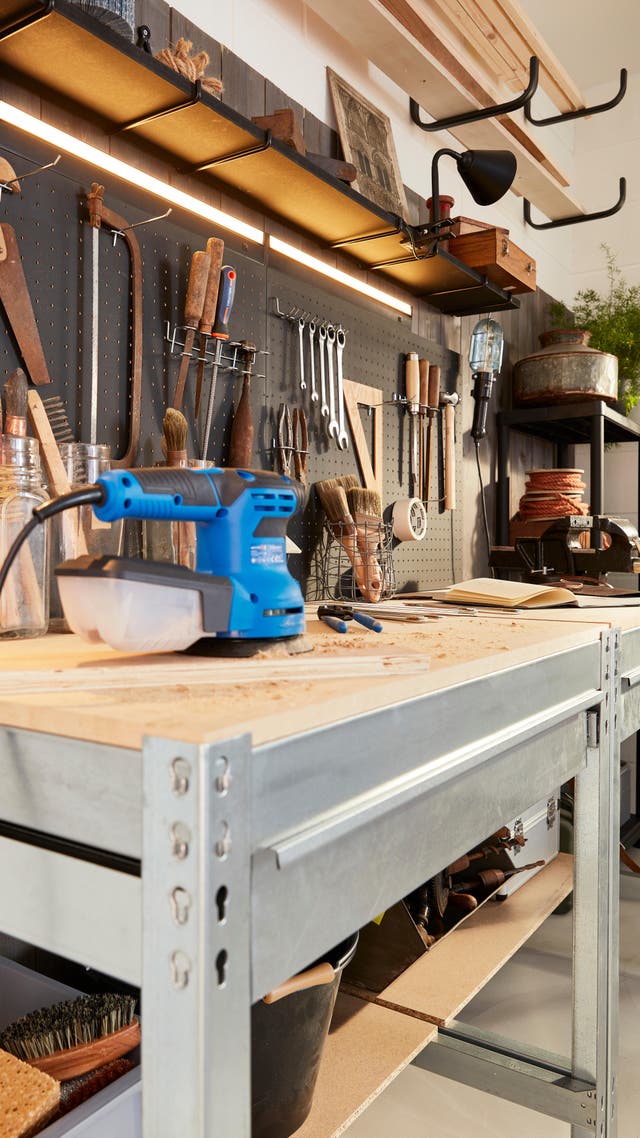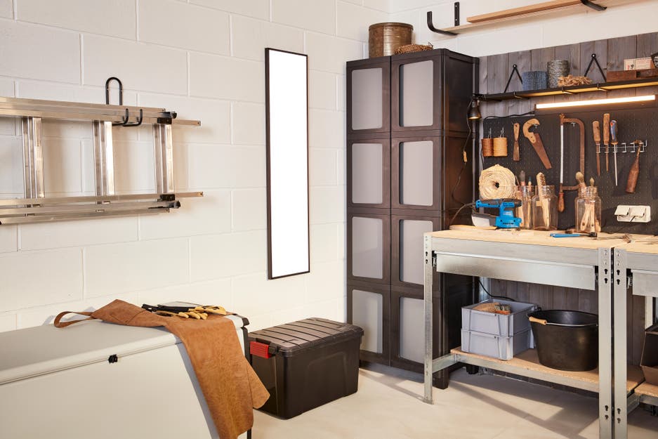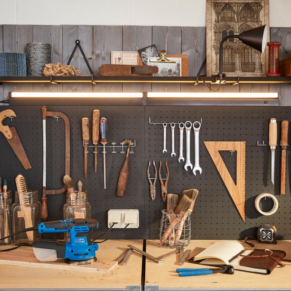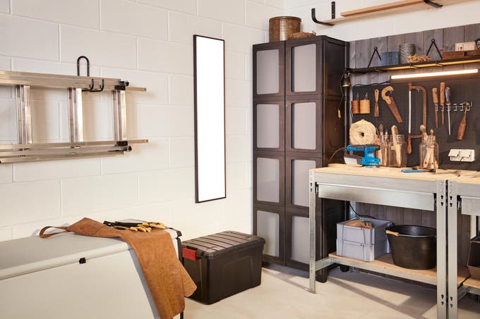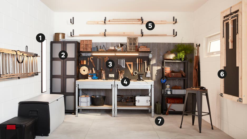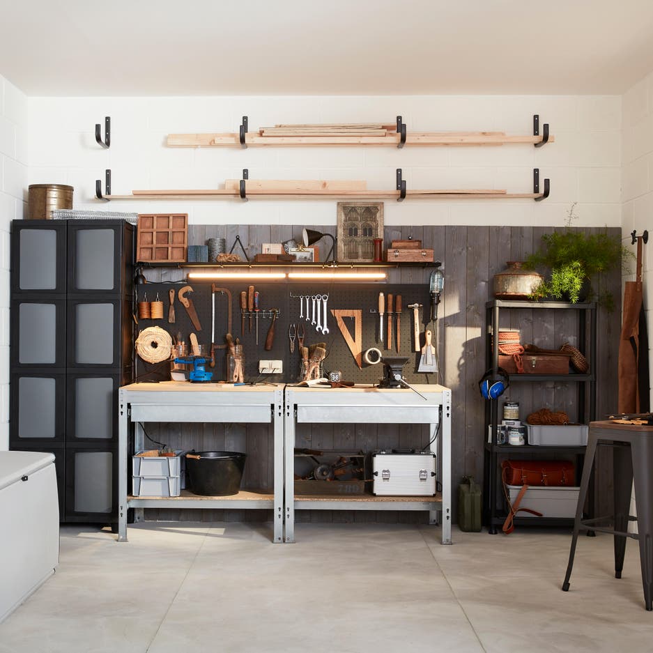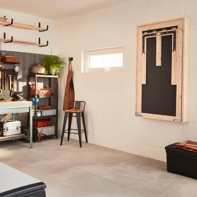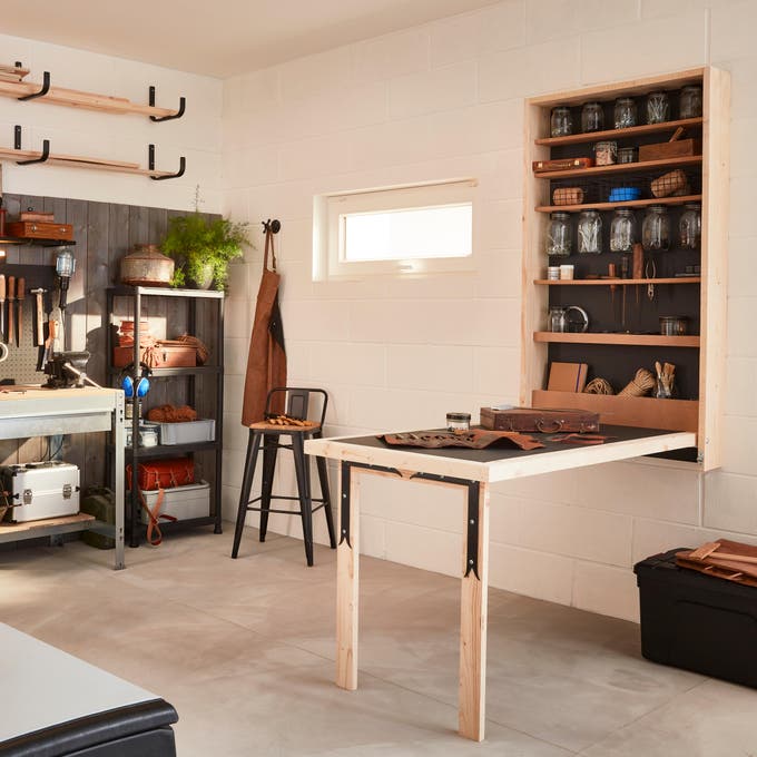 Votre garage ressemble à un débarras ? Si vous voulez le transformer en espace bien rangé où vous pourrez bricoler, il suffit de choisir du mobilier adapté et de donner quelques coups de pinceaux… et de perceuse ! Pour créer cet atelier, voici un aménagement aussi simple qu’esthétique, avec double établi, de très nombreux rangements et des solutions gain de place, comme une table rabattable sur mesure, qui sert de surface de travail quand la voiture est de sortie... De quoi assouvir votre passion dans une atmosphère à tendance industrielle, tournée vers l’efficacité. Découvrez comment vous en inspirer.