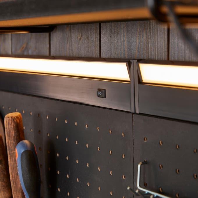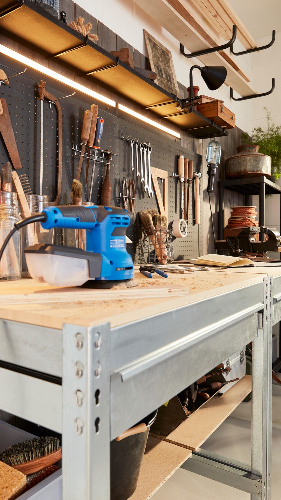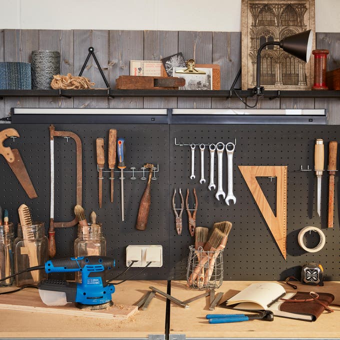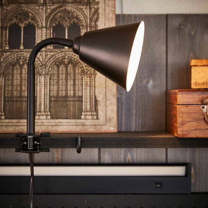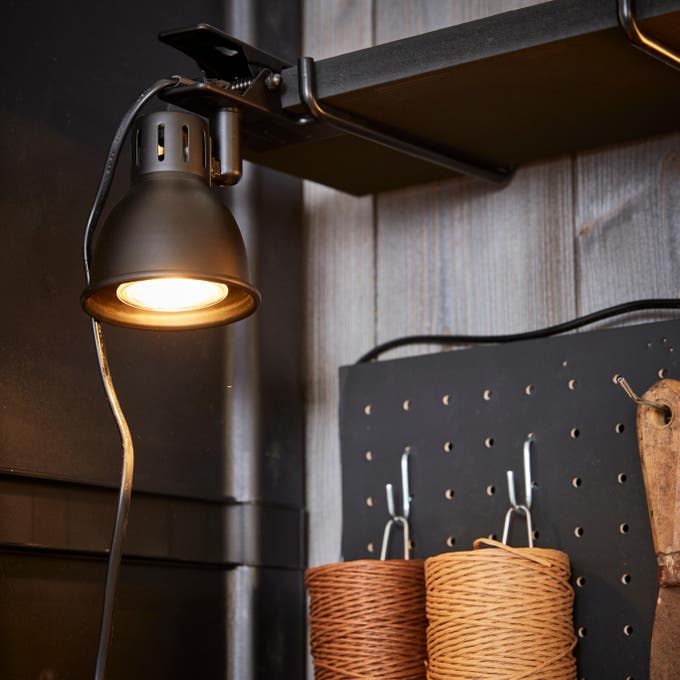 On complète avec des lampes pincées sur les étagères hautes. Orientables, elles offrent un éclairage ciblé et facilitent le travail de précision.Pratique aussi, la lampe « baladeuse », facile à déplacer et à accrocher.