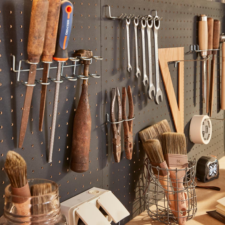 Fixé au mur sur la largeur des établis, un panneau perforé équipé de multiples supports permet d’organiser et de classifier le petit outillage, facilement repérable et toujours à portée de main : tournevis, clés, équerres, ciseaux, ficelle, etc.Au-dessus, une longue étagère sur mesure accueille les produits et les outils que l’on utilise moins souvent.