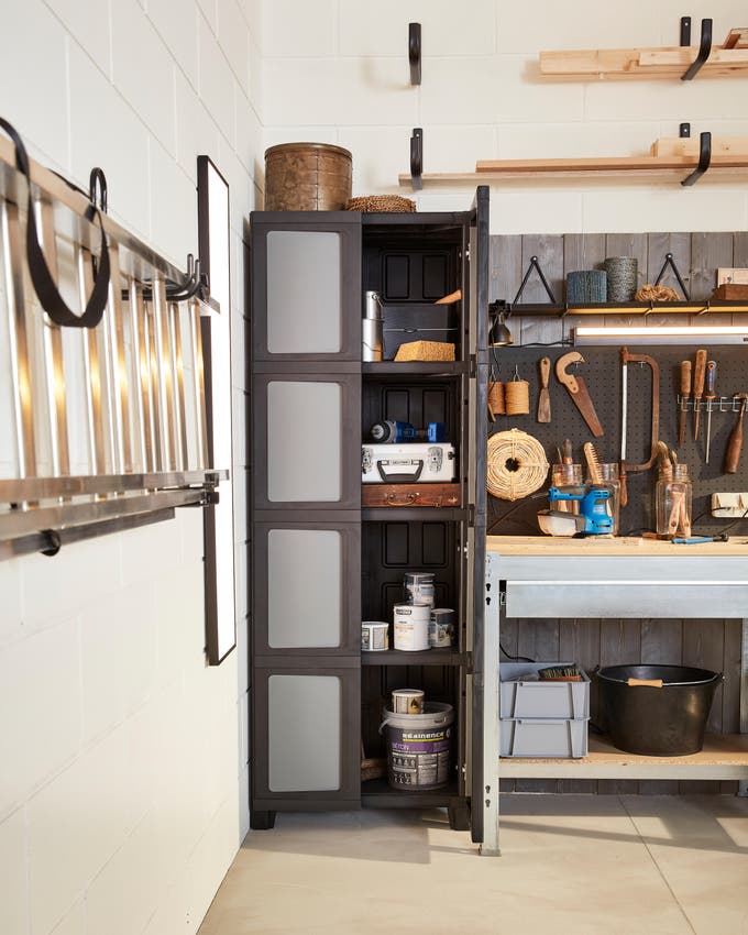On complète le linéaire avec une grande armoire fermée que l’on peut dédier à un usage : produits et accessoires pour la peinture, la menuiserie ou les travaux électriques.