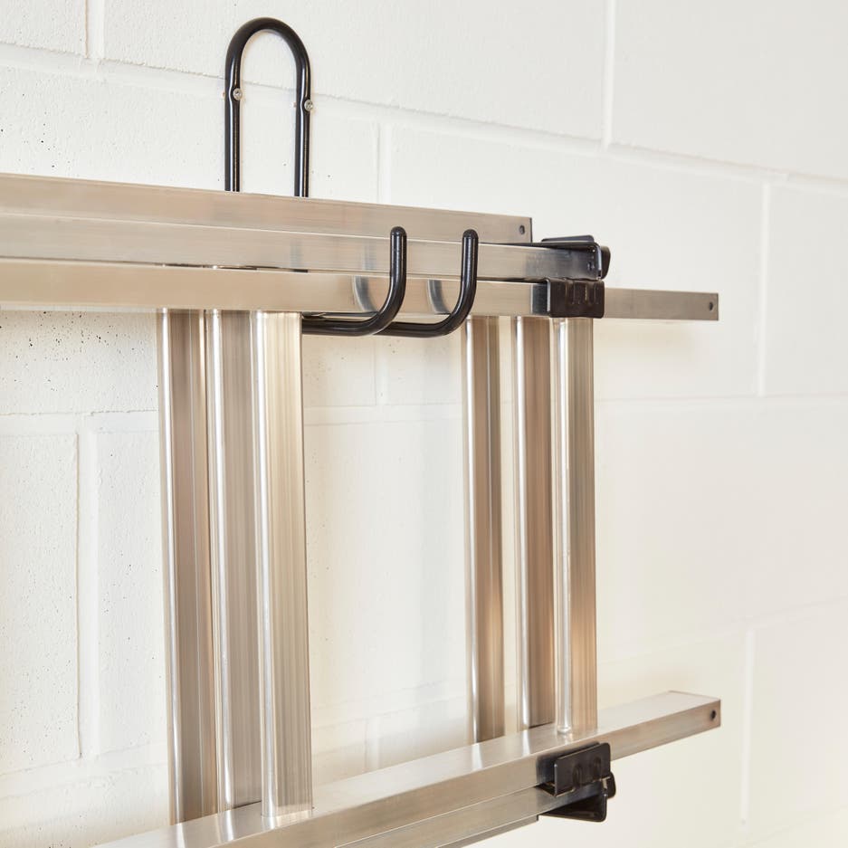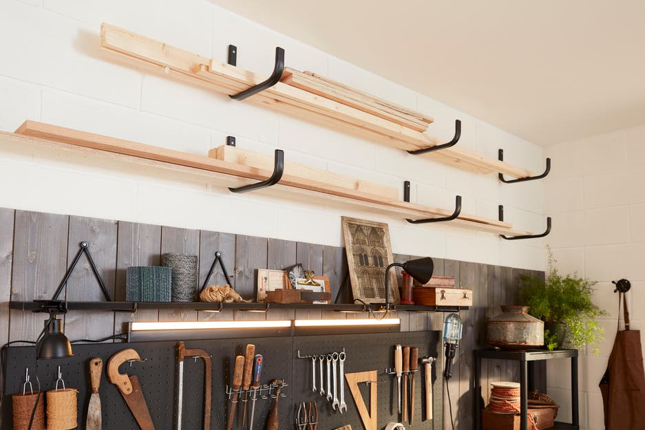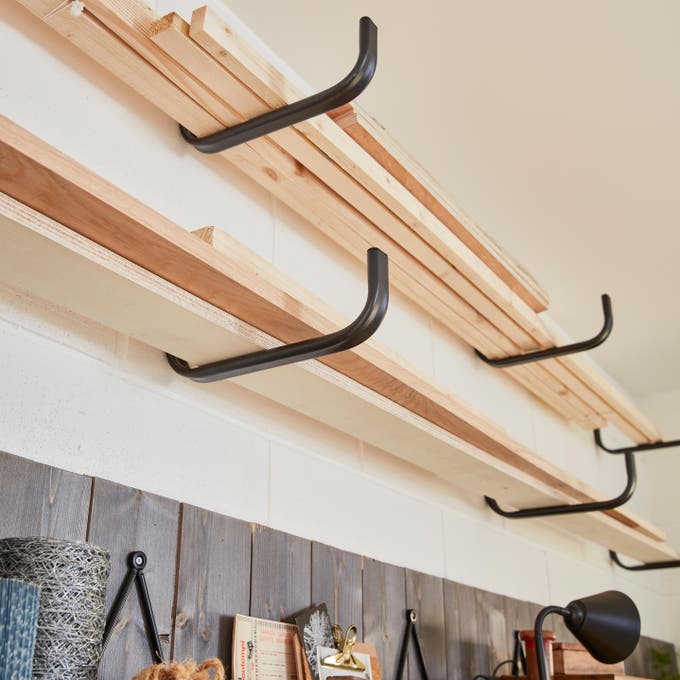 Autre solution gain de place : à l’aide de crochets fixés au mur, on crée un espace de stockage en hauteur pour les planches ou tout type de matériel long.