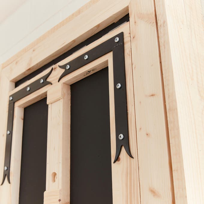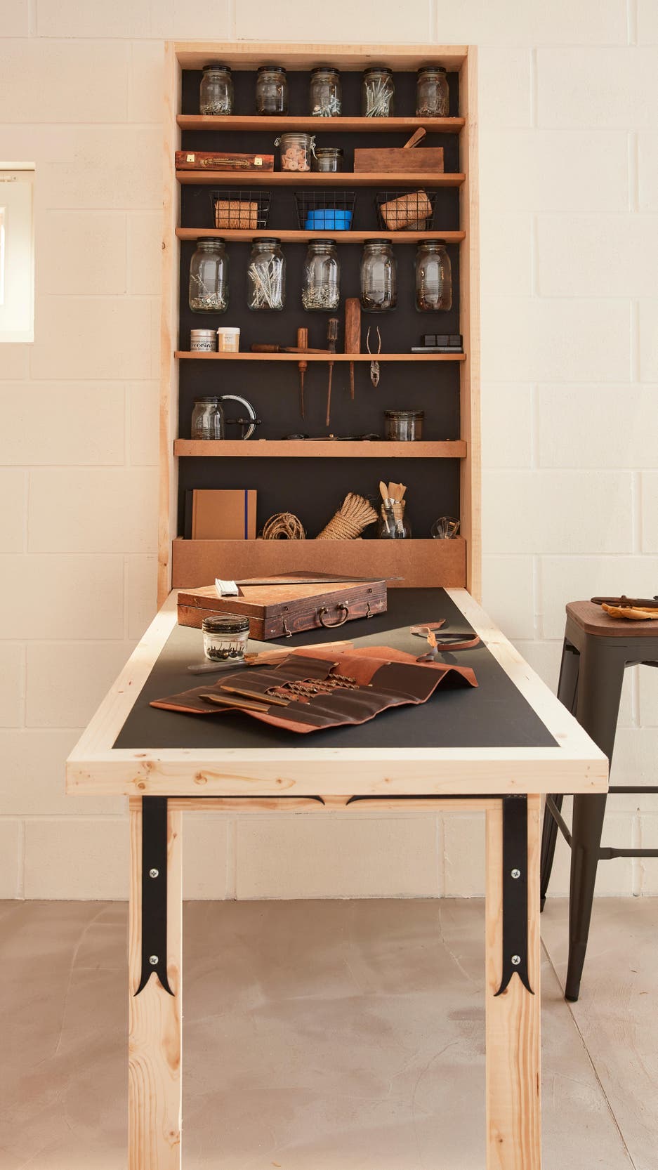 Pour adoucir et compléter cette palette de noir, de gris et de blanc, on mise sur le bois clair : le dessus de l’établi, la table rabattable DIY, les boîtes de rangement et la plupart des outils à main, pratiques et beaux, ajoutent chaleur et authenticité à l’ambiance.