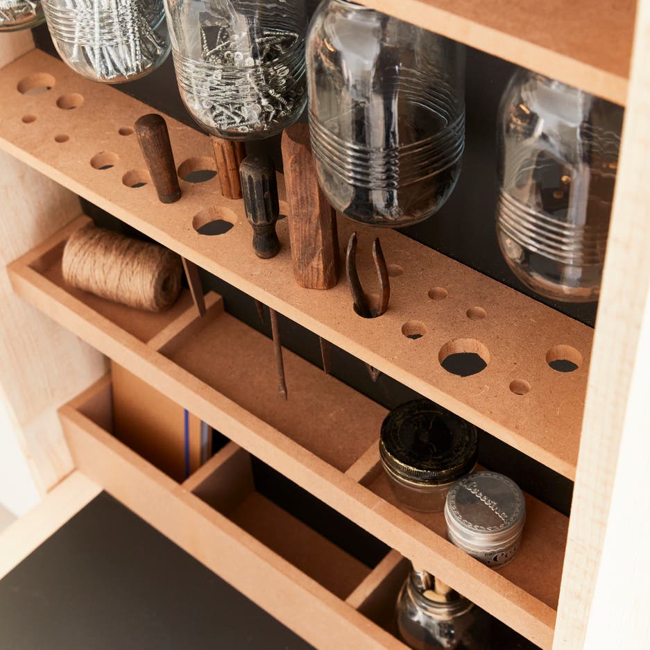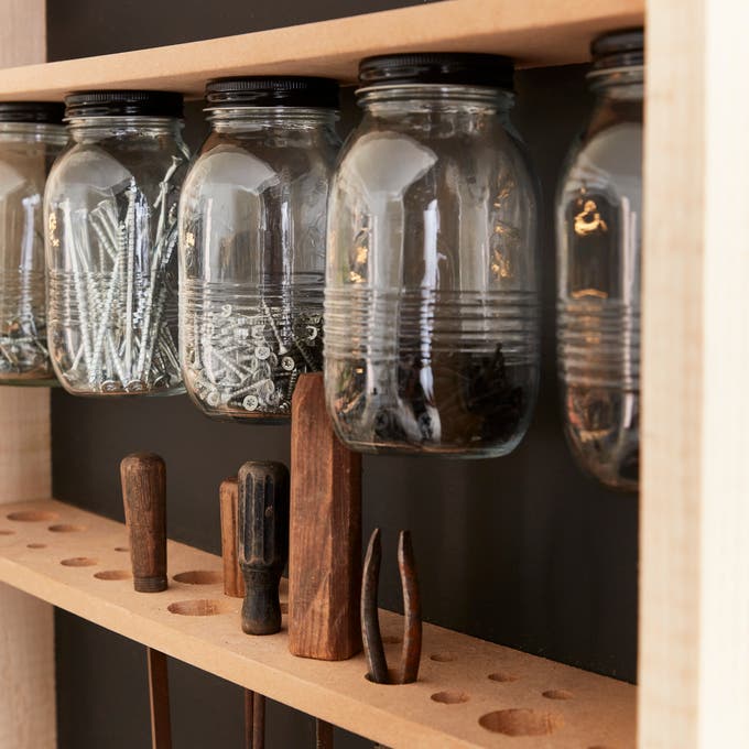 Le cadre mural comporte des rayonnages, des compartiments et des perforations adaptés aux outils et aux fournitures.La visserie est rangée dans des bocaux récupérés et vissés en sous-face.