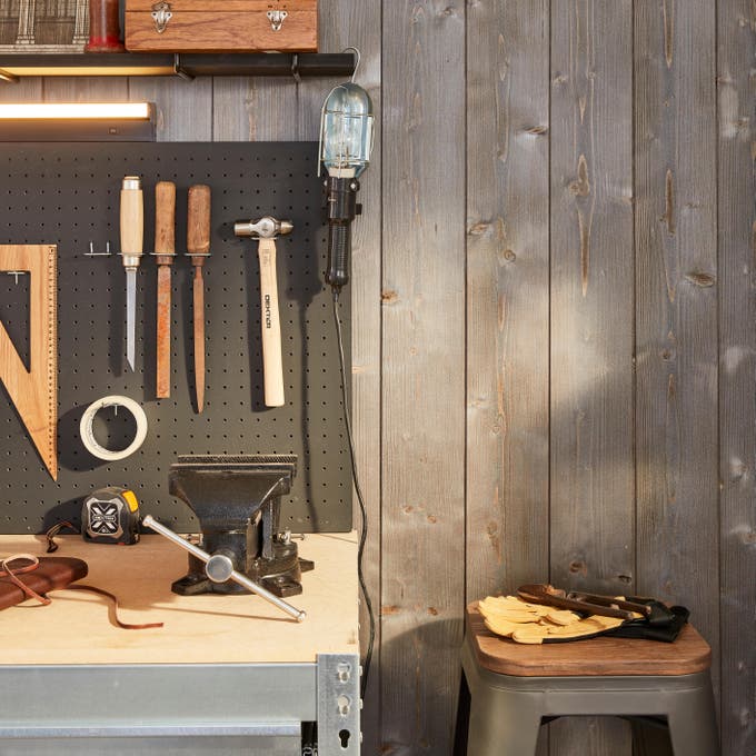 On profite de l’aménagement du garage pour lui donner un style industriel, parfaitement adapté à l’univers du bricolage. Pour la luminosité, les murs en parpaing sont peints en blanc. Le sol est revêtu d’un enduit béton gris moyen, façon atelier de garagiste mais en moins salissant ! Sur le mur du fond, les lambris coloris bois usé délimitent l’espace bricolage en apportant du relief et une note chaleureuse. Côté mobilier et rangements utilitaires, on préfère des éléments gris foncé, sobres et élégants. Le panneau mural perforé et l’étagère haute sont peints en noir, en harmonie avec les crochets, les équerres et les luminaires en métal.