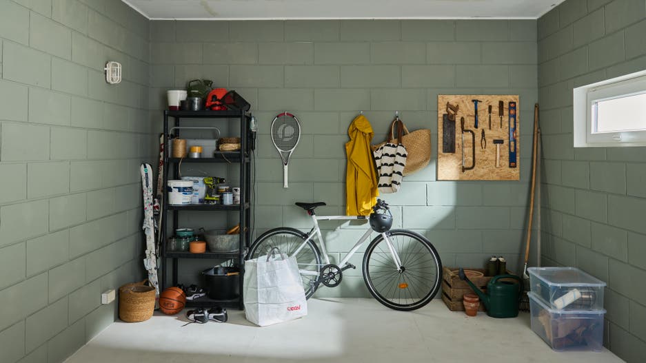 Dans ce garage non aménagé, tout est stocké en vrac, à même le sol, dans des caisses ou sur une étagère. Difficile de s’y retrouver ! L’espace est encombré, malgré quelques clous qui permettent de suspendre vêtements, sacs ou raquette. Des outils de bricolage ont été accrochés sur un panneau, mais impossible de s’en servir sur place, rien n’est prévu pour cela.