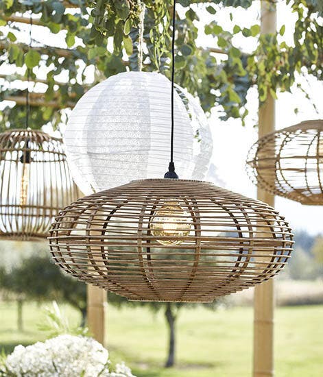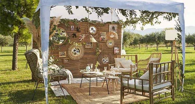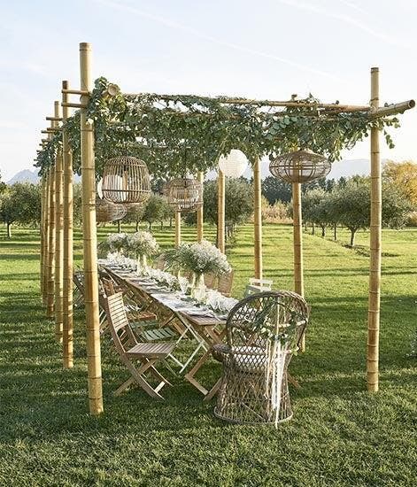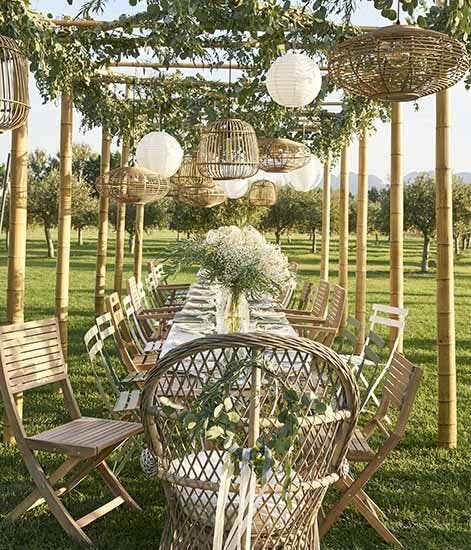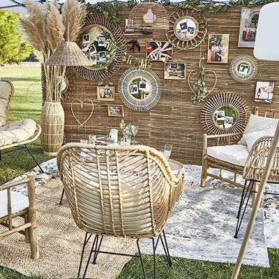 Pourquoi louer une salle lorsque l’on dispose d’un jardin ? Suivant sa surface et le nombre d’invités, on peut varier les installations pour accueillir tous les types de festivités… Un mariage, un anniversaire ou un repas de famille ? Tout l’aménagement est pensé pour le bonheur des invités : grande tablée installée sous une tonnelle en bambous, salons d’extérieur sous gazebo ou voile d’ombrage et coin brasero avec canapés pour prolonger la soirée. Des arches fleuries et une allée de pas japonais phosphorescents complètent le décor décontracté. Mobilier, luminaires, vaisselle, objets et textiles s’harmonisent dans un style champêtre et bohème.