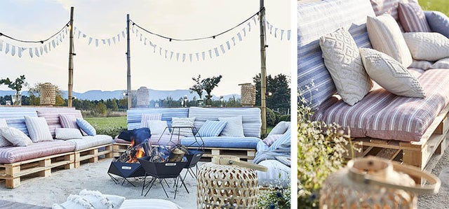 Côté mobilier, on opte pour des canapés palettes revêtus de gros coussins en toile à matelas que l’on peut facilement remiser par mauvais temps.