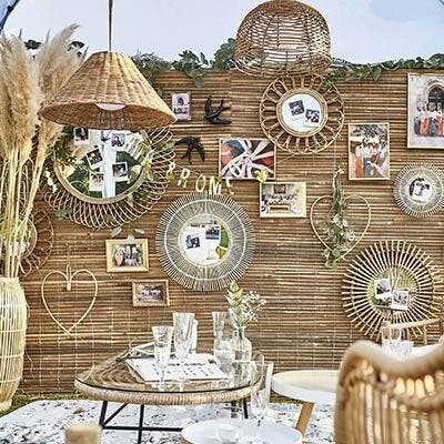 Ce « mur » éphémère permet d’accrocher des objets empruntés à la déco intérieure : miroirs, photos de famille encadrées, etc.