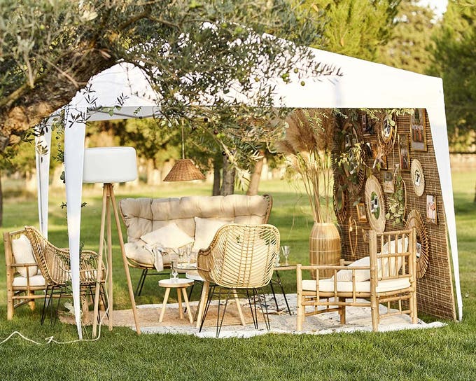 Pour avoir la sensation d’être dans une vraie pièce tout en étant dehors, on installe une paroi sur l’un des côtés du gazebo en suspendant des canisses en osier à la structure.