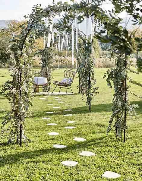 2. Une suite d’arches fleuries qui chemine vers un duo de fauteuils propice à la conversation… et aux portraits souvenirs !