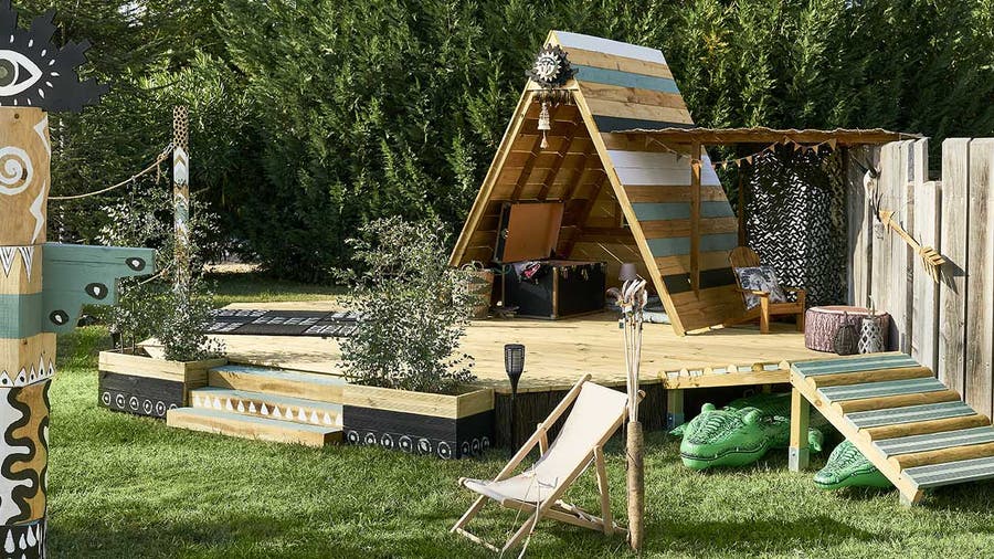 Pour compléter le mur du fond peint en vert, l’intérieur de la cabane est revêtu de lames de terrasse en bois et les lambourdes se transforment en poutres !