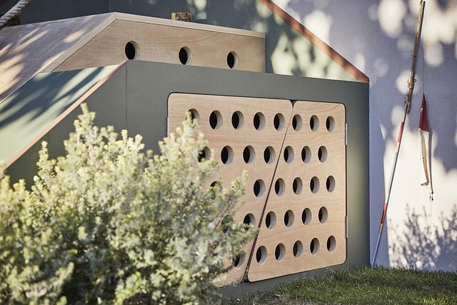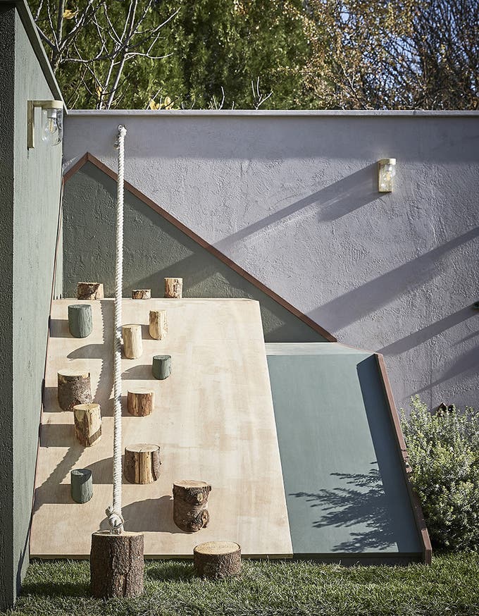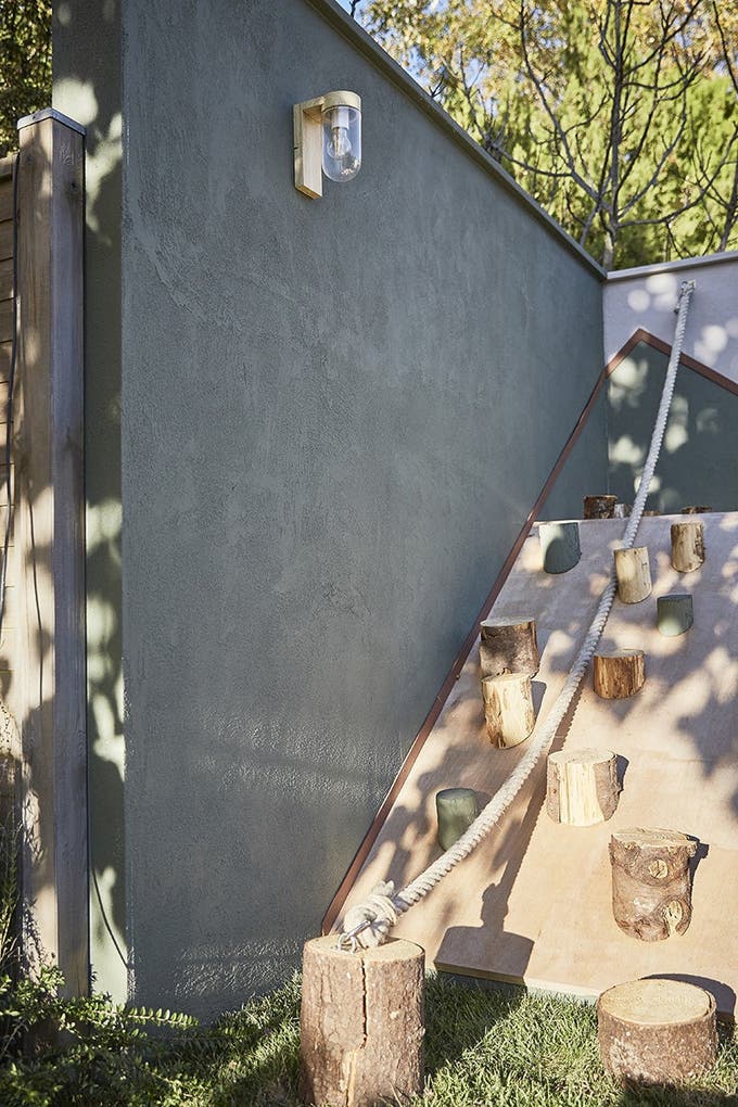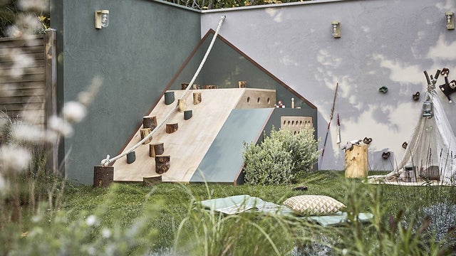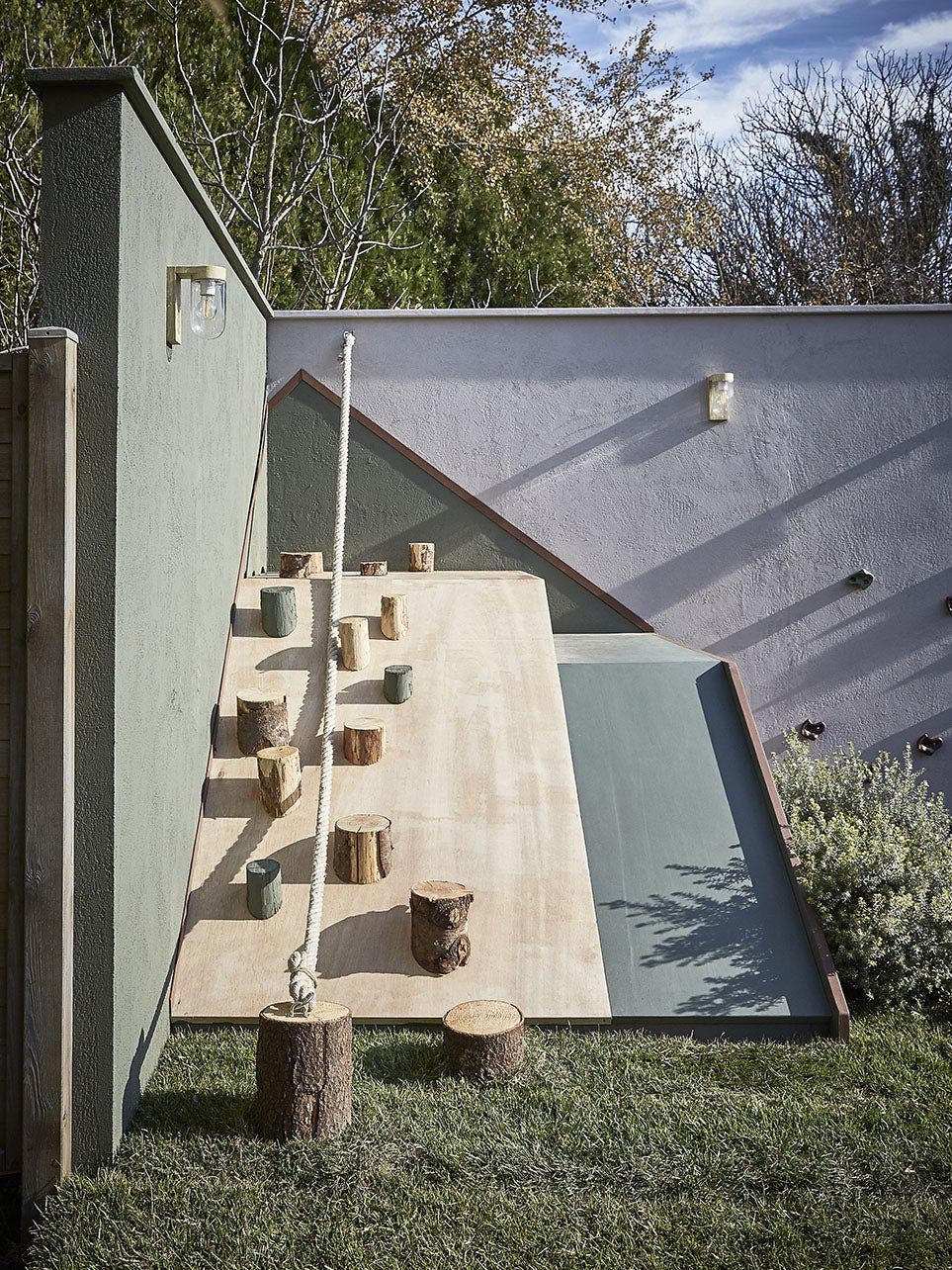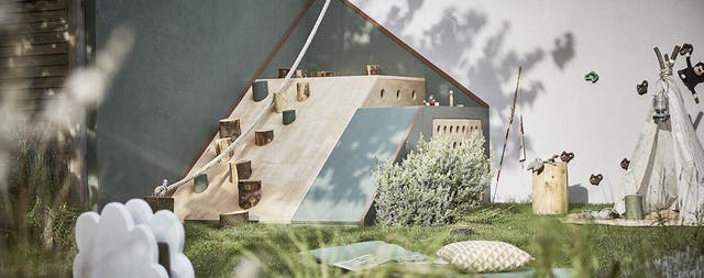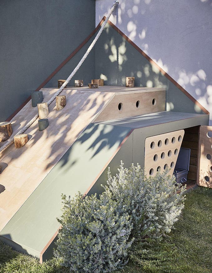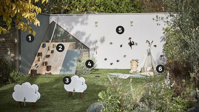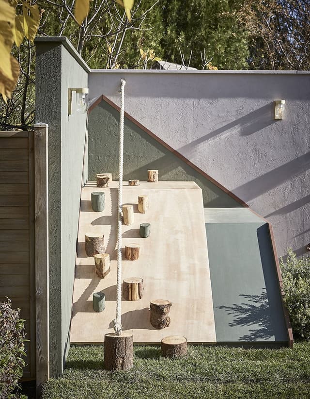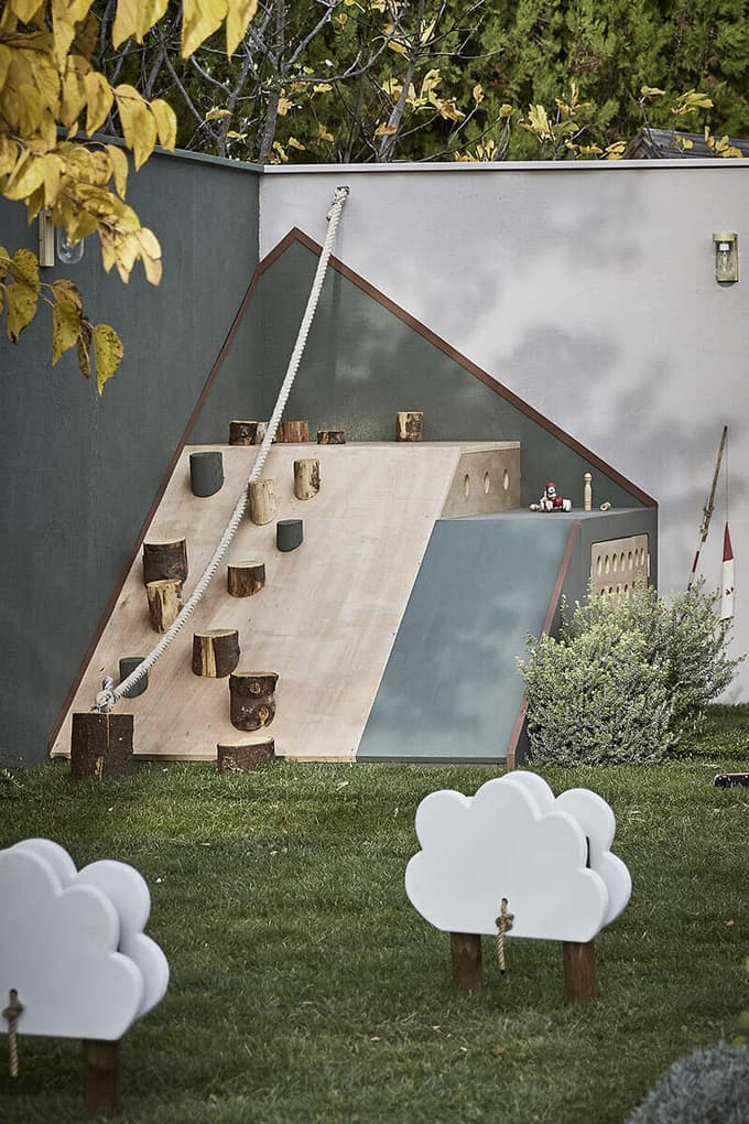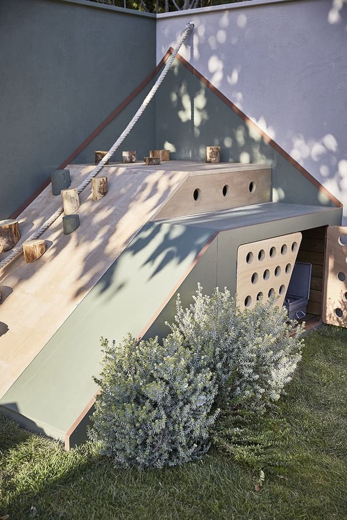 Pour que les enfants profitent du jardin dès que les beaux jours arrivent, on leur aménage une aire de jeux pleine d’astuces qui offre plusieurs types d’activités sans trop empiéter sur le terrain. Elle comprend un tremplin multifonction abritant une cabane, un mur d’escalade, des jeux DIY, un trampoline et un coin repos avec tipi, tapis et coussins. Grimper, sauter, glisser… tout est fait pour que les enfants s’amusent et se dépensent. Grâceà un choix judicieux de coloris, de formes et de matériaux, les différentes installations se fondent dans l’ambiance, pour un jardin où nature rime avec aventure.
