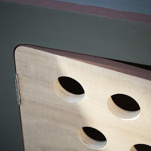 Les deux panneaux battants s’imbriquent parfaitement, avec leur découpe originale et leurs bords arrondis. On souligne l’épaisseur en brun, pour rappeler la ligne qui court sur le mur.