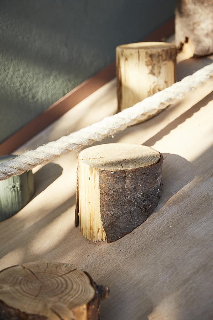 Dans le pan incliné le plus large, on intègre tout le long des rondins de diamètres différents : ils constituent un parcours à gravir en sautant d’une « marche » à l’autre.