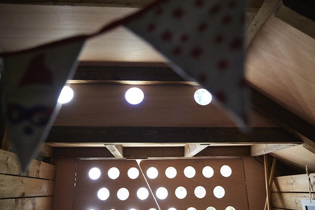 Le toit de la cabane, constitué par la partie supérieure du tremplin, comprend également trois ouvertures rondes, à la façon de petits hublots.