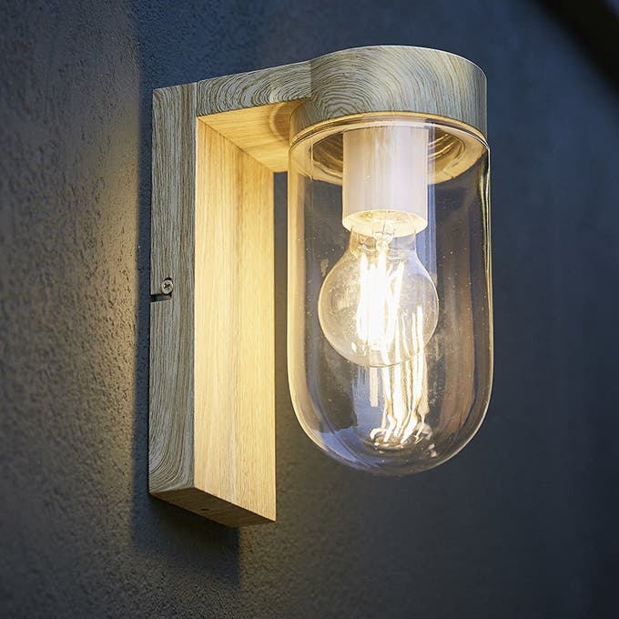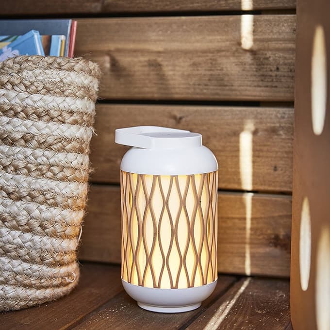 En hêtre et globe de verre, les appliques extérieures s’inscrivent dans le style champêtre du jardin, tout comme les lanternes solaires mixant métal et décor en bois clair.