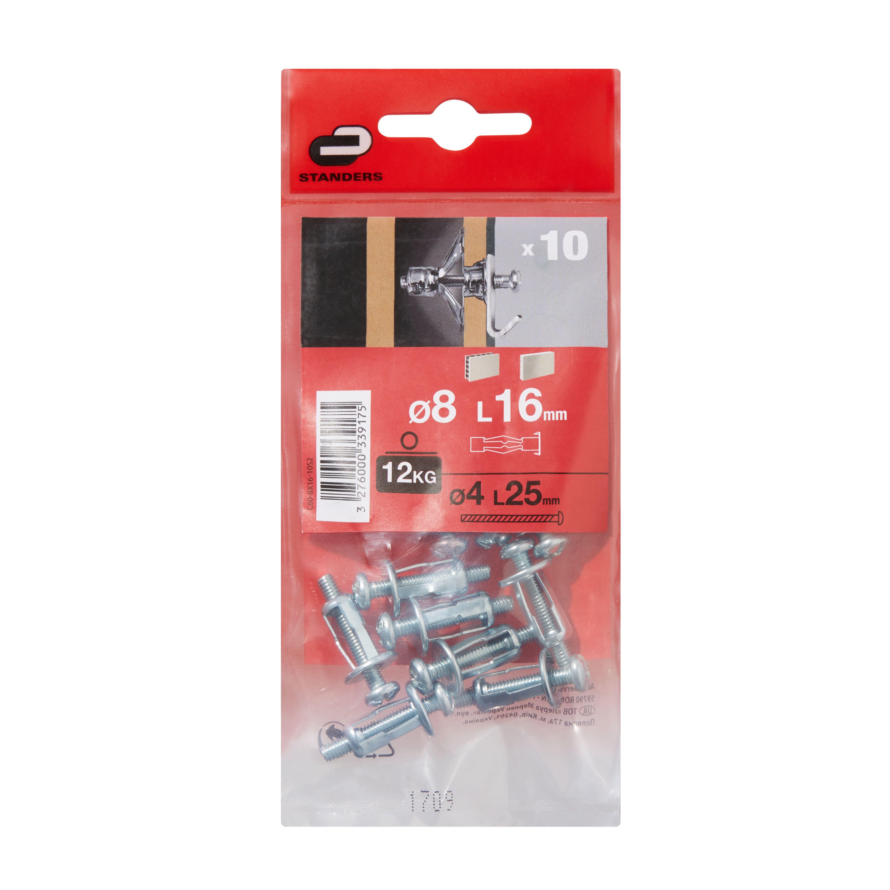 Pack Standers de 10 vis avec chevilles à expansion en acier pour matériaux creux. Dimensions des vis : 25 mm (longueur). Mesures du talon : 8 x 16 mm (largeur x longueur).