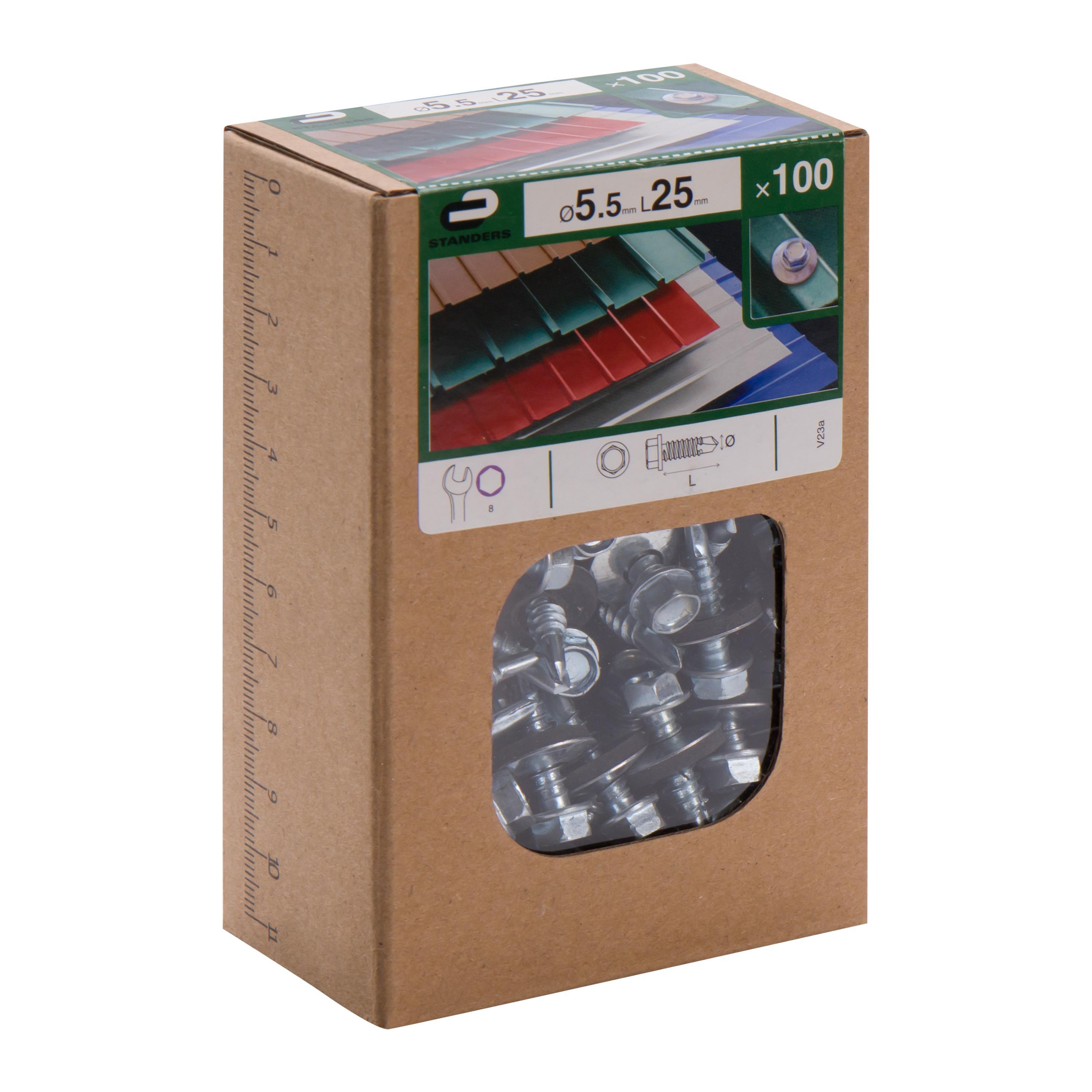 Paquet de 100 vis à métal à tête hexagonale Standers. Dimensions : 5,5 mm de diamètre et 25 mm de longueur.