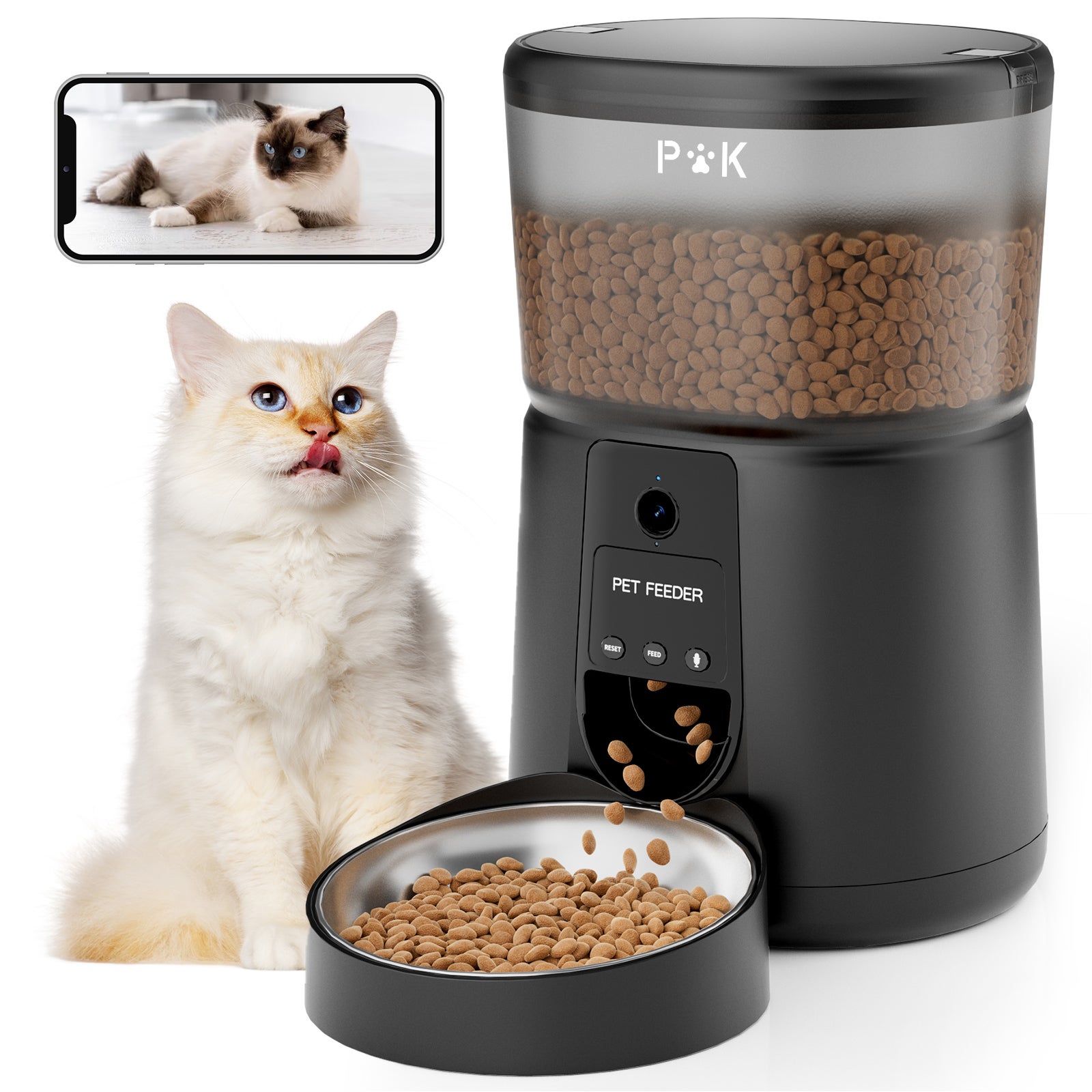 → Distributeur avec vidéo:Doté d'une qualité d'image haute définition de 2 mégapixels (résolution 1920*1080), il prend en charge la surveillance en temps réel, vous permettant de suivre à tout moment et en tout lieu l'alimentation de votre animal.De plus, il dispose d'un haut-parleur haute définition intégré, vous permettant d'interagir à distance avec votre animal de compagnie.